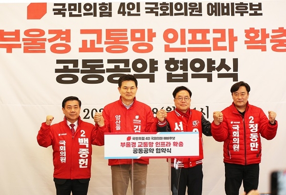 국민의힘 부산, 울산, 경남 지역 예비후보 4명이 18일 김태호 예비후보 선거사무소에서 부산·울산·경남을 대한민국 대표 메가시티로 도약시키기 위한 광역철도 공동 공약 발표 기자회견 및 협약식을 개최했다.