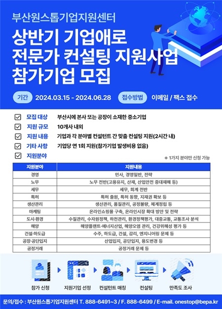 연중 상반기와 하반기로 나눠 2회에 걸쳐 실시하며 상‧하반기 각각 10개사를 선정해 총 20개사를 지원한다. 지원대상은 부산지역 내 본사 또는 공장이 소재한 중소기업이며 자격 검토를 통해 최종 선정한다. 부산원스톱기업지원센터가 컨설팅 비용을 전액 지원함에 따라 선정된 기업은 무료로 이 서비스를 이용할 수 있다. 상반기 서비스 신청 접수는 6월 28일까지 진행된다.