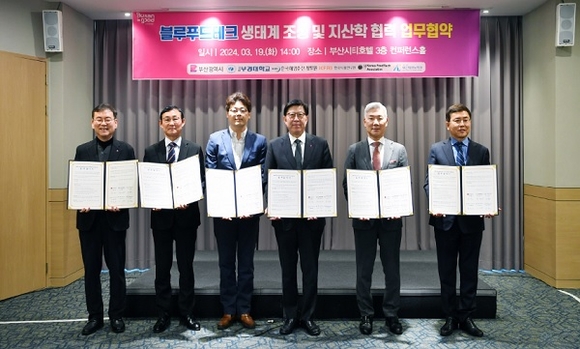부산시가 19일 부산시티호텔에서 국립부경대학교, 한국해양수산개발원, 한국식품연구원, 한국푸드테크협의회, 부산테크노파크와 '블루푸드테크 생태계 조성 및 지·산·학 협력체계 구축을 위한 업무협약'을 체결했다고 밝혔다.