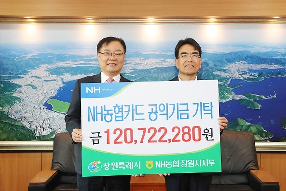 경남 창원시는 김갑문 NH농협은행 창원시지부장 등 관계자 3명이 20일 시청 접견실에서 2023년도 제휴카드 적립기금 1억 2072만 원을 홍남표 시장에게 전달했다고 밝혔다.