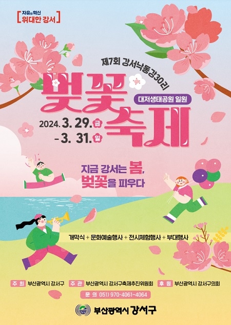 부산 강서구가 오는 29일부터 31일까지 사흘간 대저생태공원 일원에서 ‘제7회 강서낙동강30리 벚꽃축제’를 개최한다고 밝혔다.