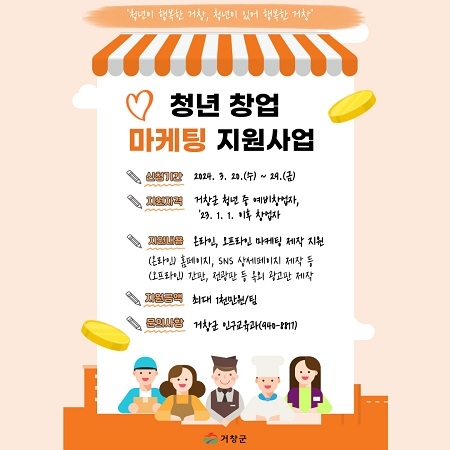 경남 거창군이 오는 29일까지 청년의 성공적인 창업기반을 조성하기 위해 창업의 중심인 마케팅 분야를 지원하는 '2024년 청년 창업 마케팅 지원사업'에 참여할 업체를 모집한다.