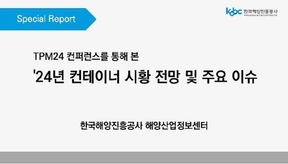 한국해양진흥공사가 20일 ‘TPM(Trans Pacific Maritime)24 컨퍼런스를 통해 본 2024년 컨테이너 시황 전망 및 주요 이슈’ 보고서를 발간했다.