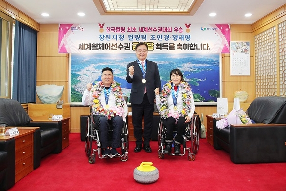경남 창원시는 20일 오후 집무실에서 韓-최초 컬링 세계선수권 우승을 차지한 시청 휠체어컬링팀 조민경·정태영 선수를 초청해 축하 자리를 마련했다.
