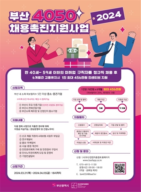 신창호 시 디지털경제혁신실장은 “이번 사업은 부산 경제의 허리층인 40․50대를 위한 양질의 일자리창출과 고용안정을 위한 것”이라며 “부산 중소·중견기업의 많은 관심과 참여를 부탁드리며 앞으로도 40․50대의 일자리 창출을 위한 다양한 시책을 펼쳐 나갈 것”이라고 전했다.