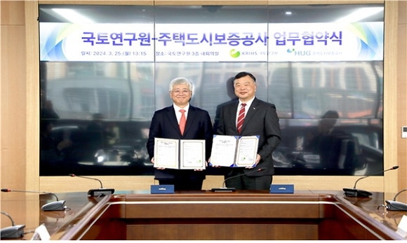 주택도시보증공사(HUG)가 국토연구원과 25일 세종시 국토연구원 대회의실에서 부동산금융 분야 정보교류와 공동연구 추진을 위한 업무협약을 체결했다고 밝혔다.