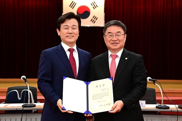 권순기 경상국립대학교 총장(오른쪽)이 조규일 진주시장으로부터 진주논개제 제전위원장 위촉장을 전달받은 뒤 기념촬영을 하고 있다. (사진=진주시 제공)
