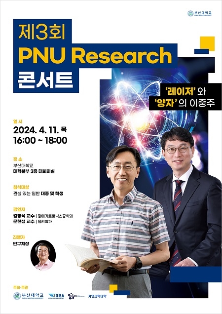 부산대학교 연구처가 탁월한 연구성과를 창출한 교내 연구자의 학술강연을 대중에게 제공하는 ‘제3회 PNU Research 콘서트’를 오는 11일 오후 4시부터 6시까지 대학본부 3층 대회의실에서 개최한다고 1일 밝혔다.
