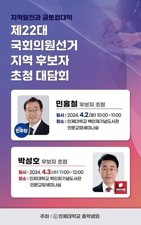 인제대학교 총학생회가 제22대 국회의원 총선을 앞두고 지역의 민홍철·박성호 후보를 학교로 초청해 학생들과의 대화의 장을 마련한다.