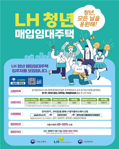 한국토지주택공사(LH)는 지난달 28일 게시된 올해 1차 '청년, 신혼·신생아 매입임대주택 입주자 모집공고' 청약 접수를 오는 8일부터 시작한다고 밝혔다.