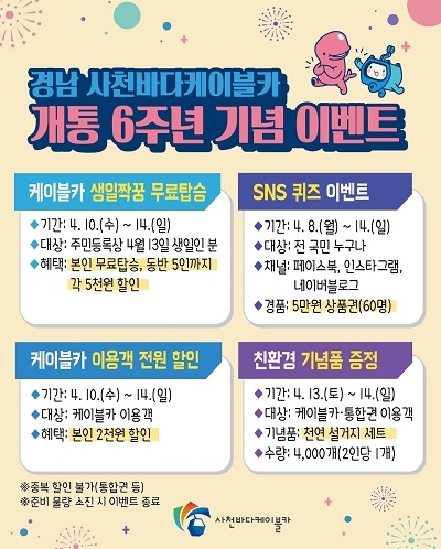 공단 한재천 이사장은 “사천바다케이블카를 방문해 주시는 많은 고객분들의 응원 덕분에 케이블카 6주년을 맞이할 수 있었다”며 “준비한 고객 감사 행사 이벤트에 많은 참여 바라며 앞으로도 고객분들께 사랑받는 사천바다케이블카가 되도록 노력하겠다”고 말했다.