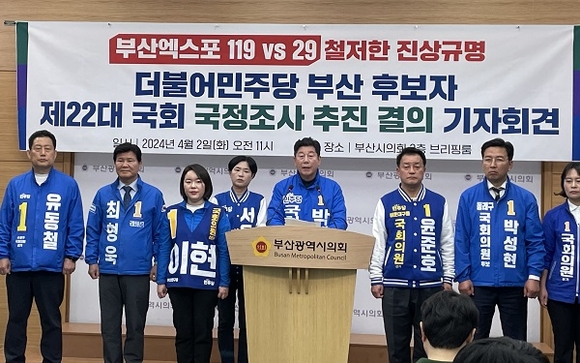 민주당 부산 후보들은 2일 부산시의회 브리핑룸에서 기자회견을 열고 “22대 국회에서 국정조사를 통해 엑스포 유치 참패의 진상을 규명하고 국민적 의혹을 해소하겠다”고 했다.