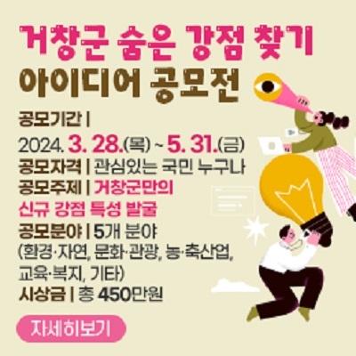 경남 거창군은 산림관광 200만 명 시대를 앞두고 지역홍보 효과와 생활인구 유입을 위한 '거창군 숨은 강점 찾기 아이디어 공모전'을 오는 5월 31일까지 진행한다고 3일 밝혔다.