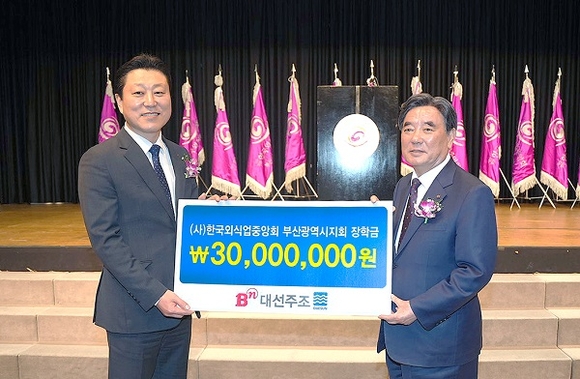 행사에는 대선주조 최성욱 본부장이 참석해 한국외식업중앙회 강인중 부산시지회장에게 장학금 3천만 원을 전했다.