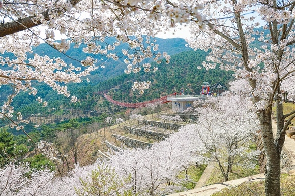식목일인 5일 경남 산청군 동의보감촌에 연분홍색 벚꽃이 만개해 봄의 향취를 더하고 있다. (사진=산청군 제공)