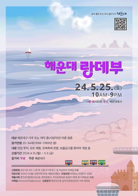 해운대구 거주자나 관내 직장인, 사업자이면서 1989년~1998년생 미혼 청년 40명을 모집한다. 안전한 만남을 위해 혼인증명서와 범죄경력회보서를 제출해야 한다.