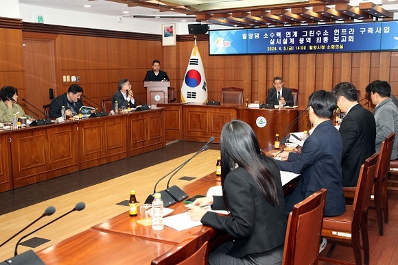 밀양시는 5일 시청 소회의실에서 경남도, 밀양시, 한국수자원공사와 용역사인 주식회사 유신 관계자가 참석한 가운데 '밀양댐 소수력 연계 그린수소 인프라 구축사업' 실시설계 용역 최종 성과보고회를 가졌다.