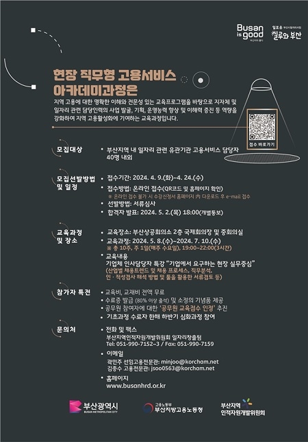 이번 교육은 지역의 고용센터 및 대학 등 일자리 사업 관계자들의 전문성 강화를 위해 마련됐으며, 부산시와 부산지방고용노동청이 주최하고 부산지역인적자원개발위원회가 주관하며 교육비는 전액 국·시비로 운영된다.