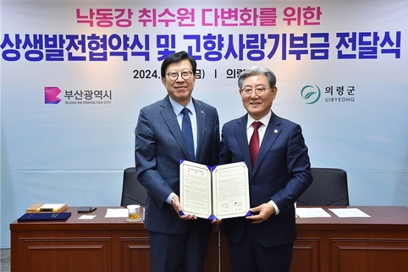 이날 상생협약식에는 평소 부산의 물 문제 해결에 많은 관심을 기울이고 있는 양재생 부산상공회의소 회장을 비롯해 재부경남향우연합회 회장, 재부의령향우회 수석부회장, 농협중앙회부산본부장 등도 참석해 이들과 시 직원이 마련한 총 2100만 원의 고향사랑기부금을 전달하며 부산과 의령 간의 상생협력에 의미를 더했다.