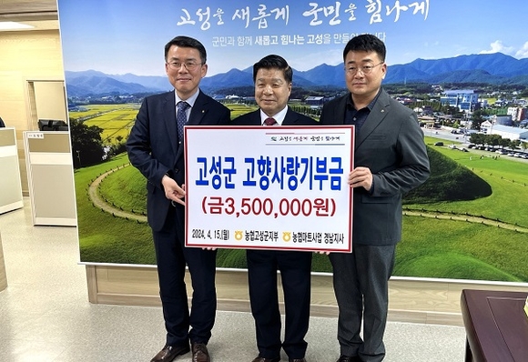 농협고성군지부가 지난 15일 농협경제지주 마트사업경남지사 임직원들이 고성군에 고향사랑기부금 350만 원을 기탁했다고 17일 밝혔다.