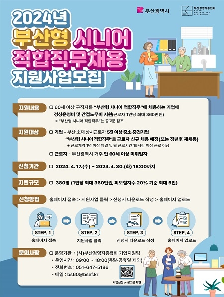 근로자 요건은 채용일 기준 부산에 거주하는 만 60세 이상 미취업자며 주 15시간 이상의 파트타임 근로자, 비정규직 채용인 경우에도 가능하다.