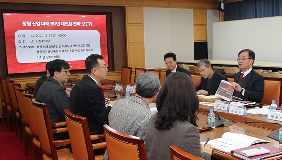 지난 2월 27일 창원시청 시정회의실에서 홍남표 시장 주재로 '창원 산업 미래 50년 대전환 전략 보고회'가 열리고 있다. (사진=창원시 제공)