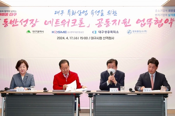 중소벤처기업진흥공단(중진공)이 17일 대구광역시청에서 대구광역시, 대구상공회의소(대구상의), 평화홀딩스와 대구광역시 특화산업 육성을 위한 ‘동반성장 네트워크론 공동지원’ 업무협약을 체결했다고 밝혔다.