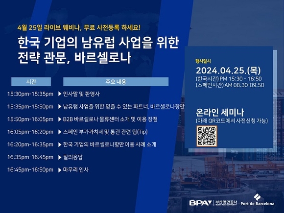 BPA는 2021년 바르셀로나항만공사와 현지 합작법인 ‘B2B 로지스틱스 부산 바르셀로나 허브(B2B Logistics Busan Barcelona Hub)을 설립해 바르셀로나항 배후에서 물류센터를 운영 중이다. BPA는 이번 온라인 세미나를 통해 우리 기업들에게 바르셀로나항을 통한 남유럽 시장 진출 정보를 제공할 예정이다.