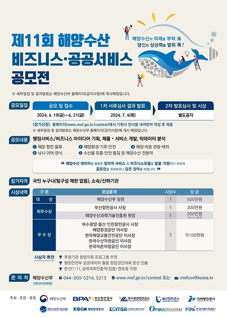 부산항만공사(BPA)가 해양수산부 등과 공동으로 ‘제11회 해양수산 비즈니스·공공서비스 공모전’을 오는 19일부터 6월 21일까지 개최한다고 밝혔다.