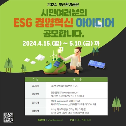 부산환경공단이 ESG 혁신경영과 지속가능한 성장을 위해 ‘시민 ESG경영 아이디어’ 공모를 진행 중이라고 18일 밝혔다.