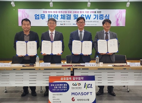 이번 협약은 관내 항공·우주·방위산업 관련 기업들을 대상으로 SW 품질 평가 및 인증 기반구축을 통한 제품 신뢰성 및 안전성 확보를 지원하는 내용이며, 진흥원과 KCL, ㈜모아소프트, 지아이시스템 주식회사가 참여했다.