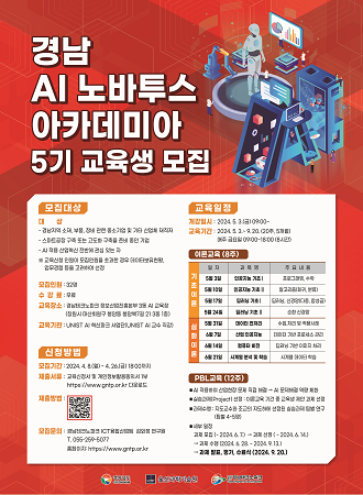 경상남도는 경남테크노파크(경남TP), 울산과학기술원(UNIST)과 함께 오는 26일까지 경남 소재·부품·장비 특화단지 AI교육인 ‘인공지능(AI) 노바투스 아카데미아’ 5기 교육생을 온라인으로 모집한다.