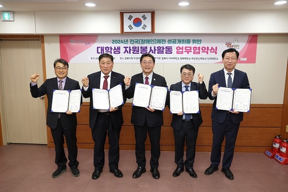 경남 김해시는 관내 4개 대학교와 2024년 전국(장애인)체전 성공 개최와 대학생 자원봉사활동 활성화를 위한 업무협약을 체결했다고 19일 밝혔다.