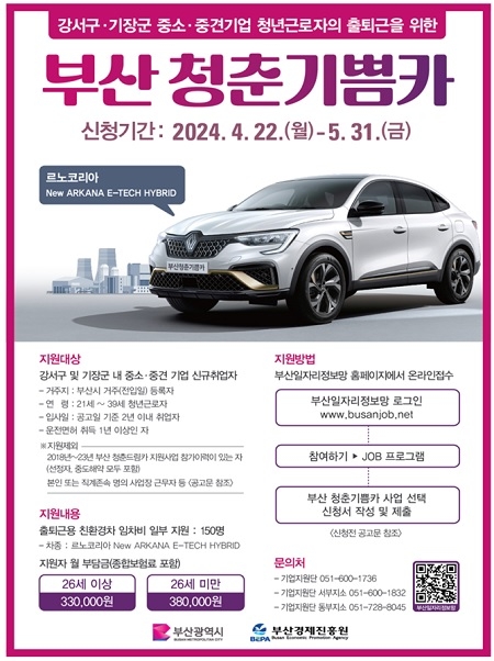 시는 산단 지역의 도시철도 노선 부재 등 여전히 해당 지역에 근무하는 청년의 출퇴근 어려움이 지속돼 올해 '부산청춘기쁨카' 사업을 재개한다.