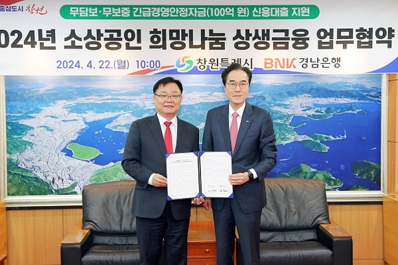 이날 협약에 따라 창원시와 경남은행은 소상공인 긴급경영안정 자금 100억 원 신용 대출을 지원키로 했다.