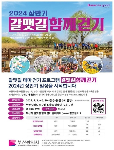 걷기에 관심 있는 시민이라면 누구나 무료로 참가할 수 있다. 참가자는 오는 24일부터 시 갈맷길 누리집을 통해 선착순으로 모집할 예정이다.