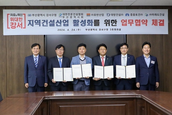 강서구, 대한전문건설협회(부산시회), 호반산업 등 4개 건설사는 3자 간 협약을 체결해 ▲구는 지역사업 추진이 원활히 진행할 수 있도록 적극 지원 ▲협회는 회원사의 경쟁력 강화 ▲건설사는 지역 전문건설업체의 하도급 참여가 70% 이상 될 수 있도록 지원하기로 했다
