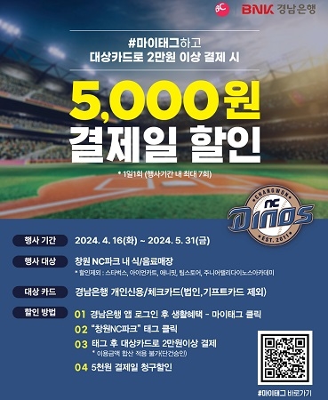경남은행 모바일뱅킹앱 ‘마이태그’에서 ‘창원 NC파크’를 태그한 후 경남BC카드를 이용해 창원 NC파크 내 식·음료매장에서 건당 2만 원 이상 결제하면 5000원을 청구 할인 받을 수 있다.