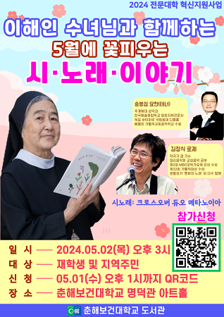 춘해보건대학교 도서관은 다음달 2일 오후 3시부터 명덕관 아트홀에서 2024년 전문대학 혁신지원사업의 일환으로 ‘이해인 수녀님과 함께하는 북콘서트’ 행사를 개최한다고 26일 밝혔다.
