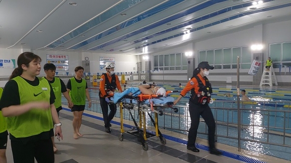 훈련 내용은 수영장 내 다이빙 시 경추골절 발생 상황을 가정해 응급환자 구조에서부터 119 신고, 응급처치, 119 구조대 도착과 병원이송까지의 상황을 시연했다.