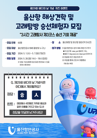울산항만공사(UPA)는 ‘바다의 날’을 기념해 대국민 참여 행사로 ‘울산항 해상견학 및 고래탐방 승선체험’을 기획하고 참여자 모집을 위한 퀴즈 이벤트를 개최한다고 2일 밝혔다.