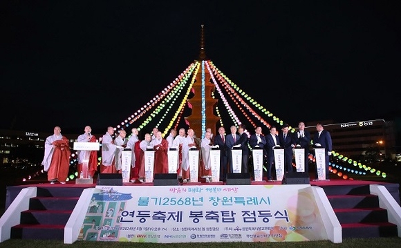 경남 창원시는 지난 1일 오후 7시 창원광장에서 시 불교연합회 주관으로 관내 사찰 주지 스님과 홍남표 시장, 최형두 국회의원을 비롯한 관계자 등 시민 200여 명이 참석한 가운데 불기2568년 부처님오신날을 축하하기 위한 봉축탑 점등식을 가졌다. (사진=창원시 제공)
