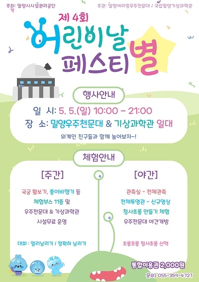 밀양시시설관리공단과 부산지방기상청이 오는 5일 어린이날에 국립밀양기상과학관·밀양아리랑우주천문대 광장에서 '제4회 어린이날 페스티별 행사'를 공동으로 연다.