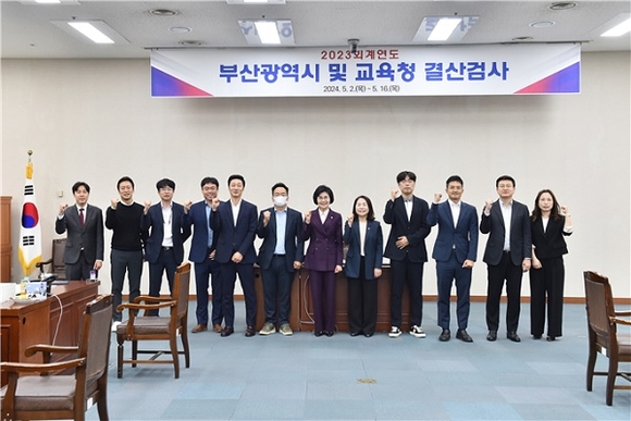 2023회계연도 결산검사를 진행하고 기념촬영을 하고 있다.(사진=부산시 제공)