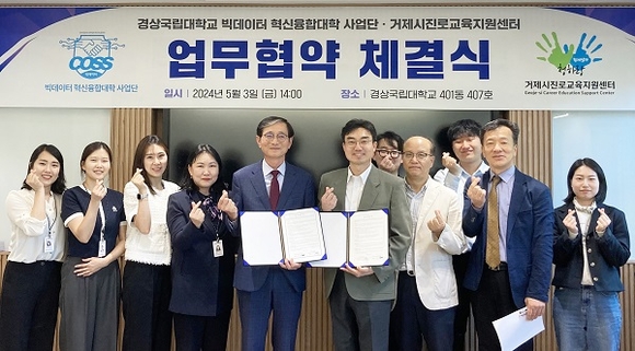 경상국립대학교 빅데이터 혁신융합대학 사업단(빅데이터 사업단)은 3일 공과대학에서 거제시 진로교육지원센터와 민·관·학 협력을 강화해 지역 청소년 맞춤형 진로교육을 구현하기 위한 업무협약(MOU)을 체결했다고 밝혔다.