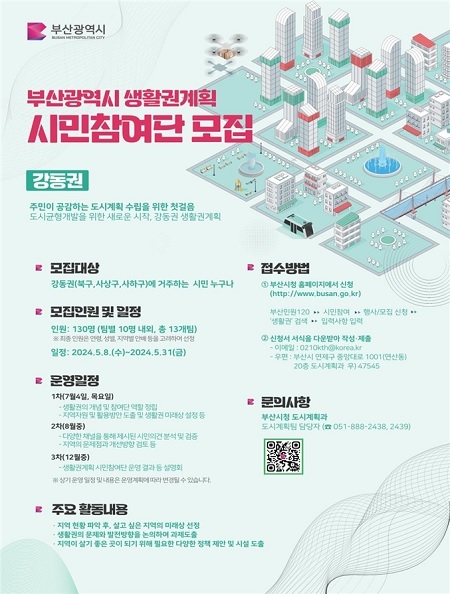 부산시가 8일부터 31일까지 강동권 시민들을 대상으로 ‘생활권계획 시민참여단’을 모집한다고 밝혔다.