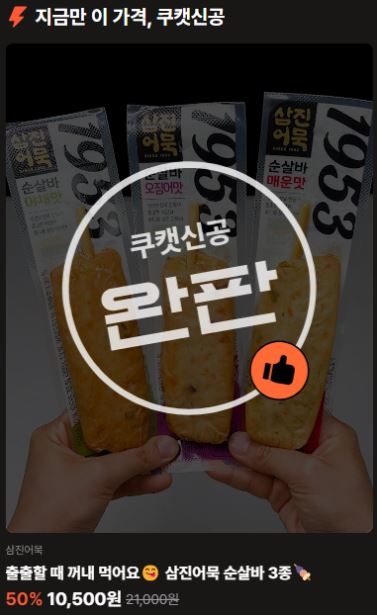 대한민국 대표 어묵 브랜드 삼진어묵이 ‘쿠캣 신상공개’를 통해 최근 출시한 신제품 ‘순살바’ 4284개 한정 판매를 완료했다고 밝혔다.