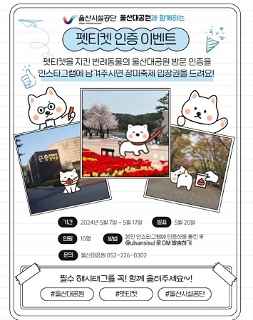 이벤트 참여방법은 울산대공원에서 펫티켓을 준수한 반려동물과 함께 찍은 사진을 필수 해시태그(#울산대공원, #펫티켓, #울산시설공단)와 함께 개인 인스타그램에 게시하면 된다. 참여자 중 10명을 추첨해 2024 울산대공원 장미축제 입장권(2매)을 지급할 예정이다.