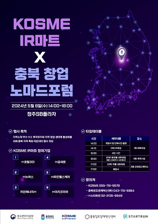 중소벤처기업진흥공단(중진공)은 8일 청주SB플라자(충북 오송)에서 ‘KOSME IR마트X충북 창업 노마드포럼’을 개최한다고 밝혔다.