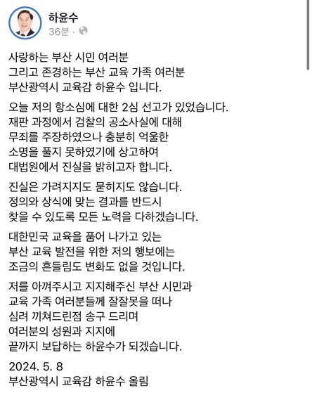 하 교육감은 2심 선고 후 자신의 페이스북을 통해 “재판 과정에서 무죄를 주장했으나 억울함을 풀지 못했기에 상고해 대법원에서 진실을 밝히겠다”고 했다.